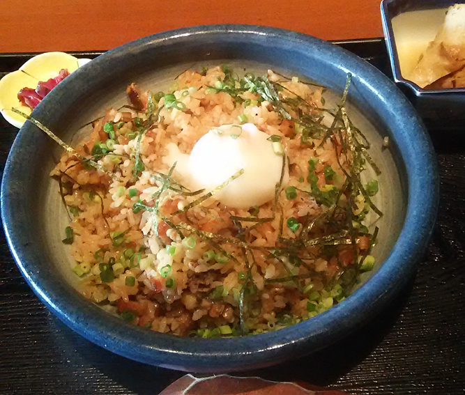 瀬戸内海で水揚げされたアナゴをまぶした焼き飯に、温泉卵をトッピングしたシンプルなご飯。蒲焼きのタレで味付けられた焼き飯は、それだけを食べても美味しいですが、とろとろの卵をまぜると二度美味しくなります。